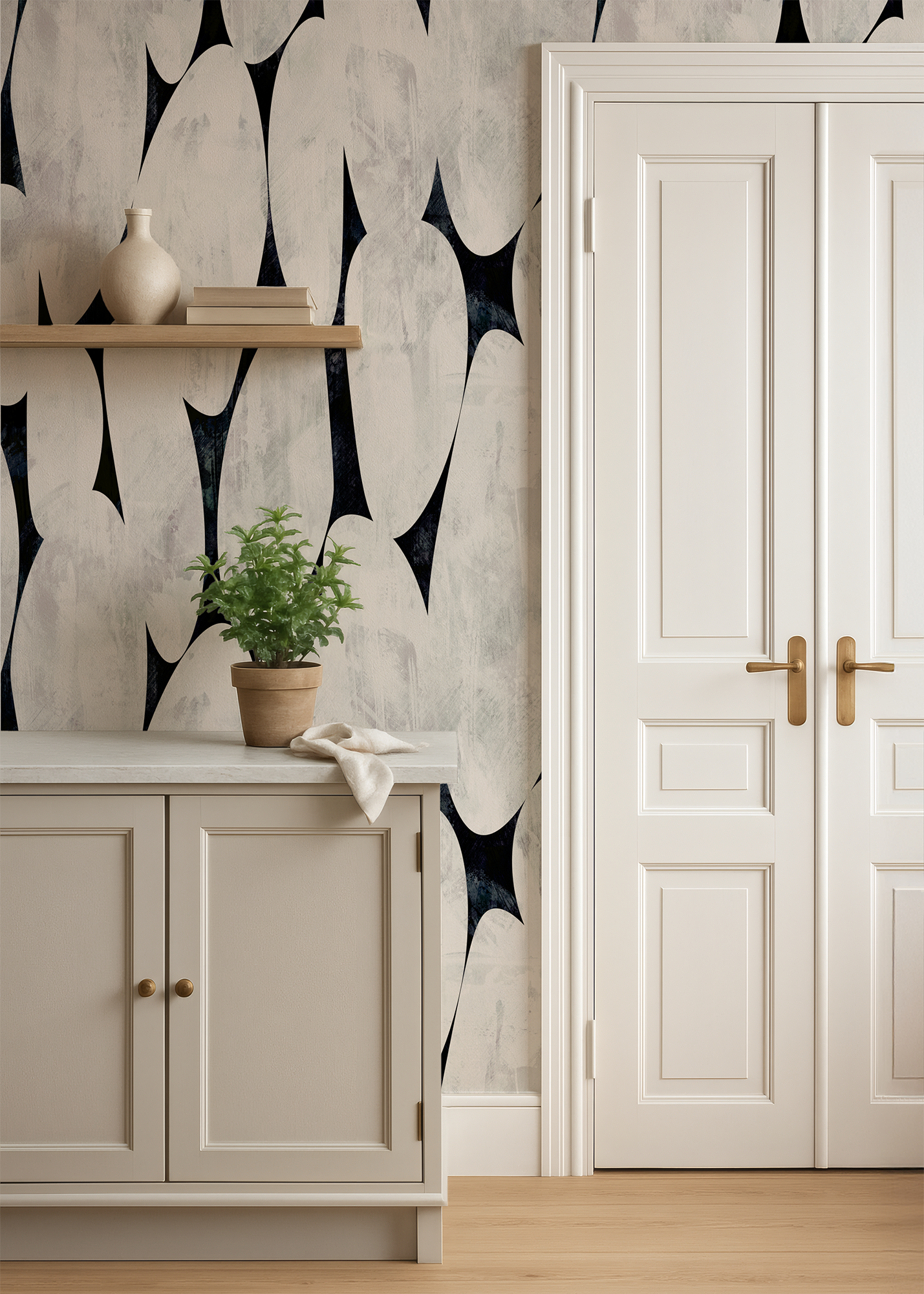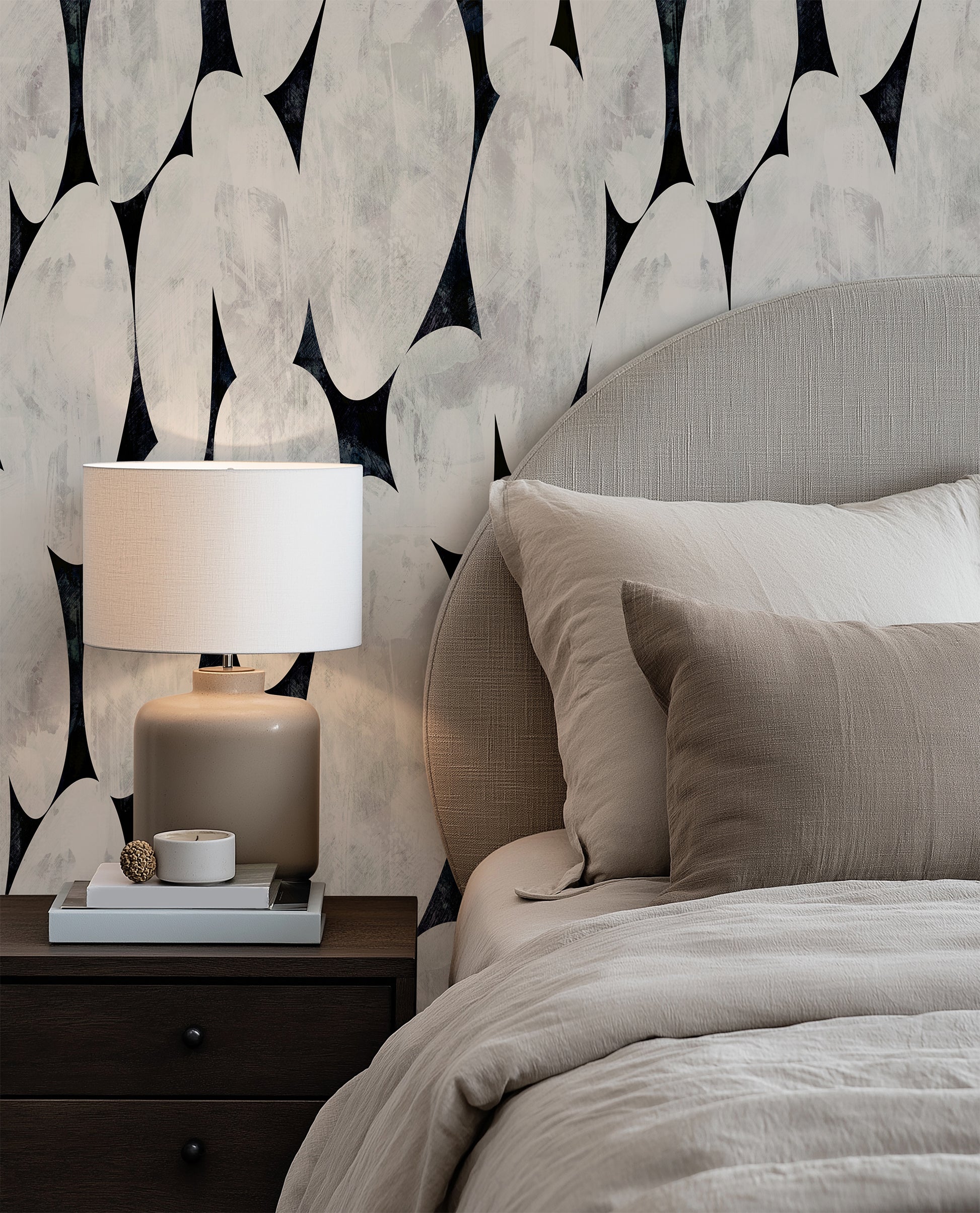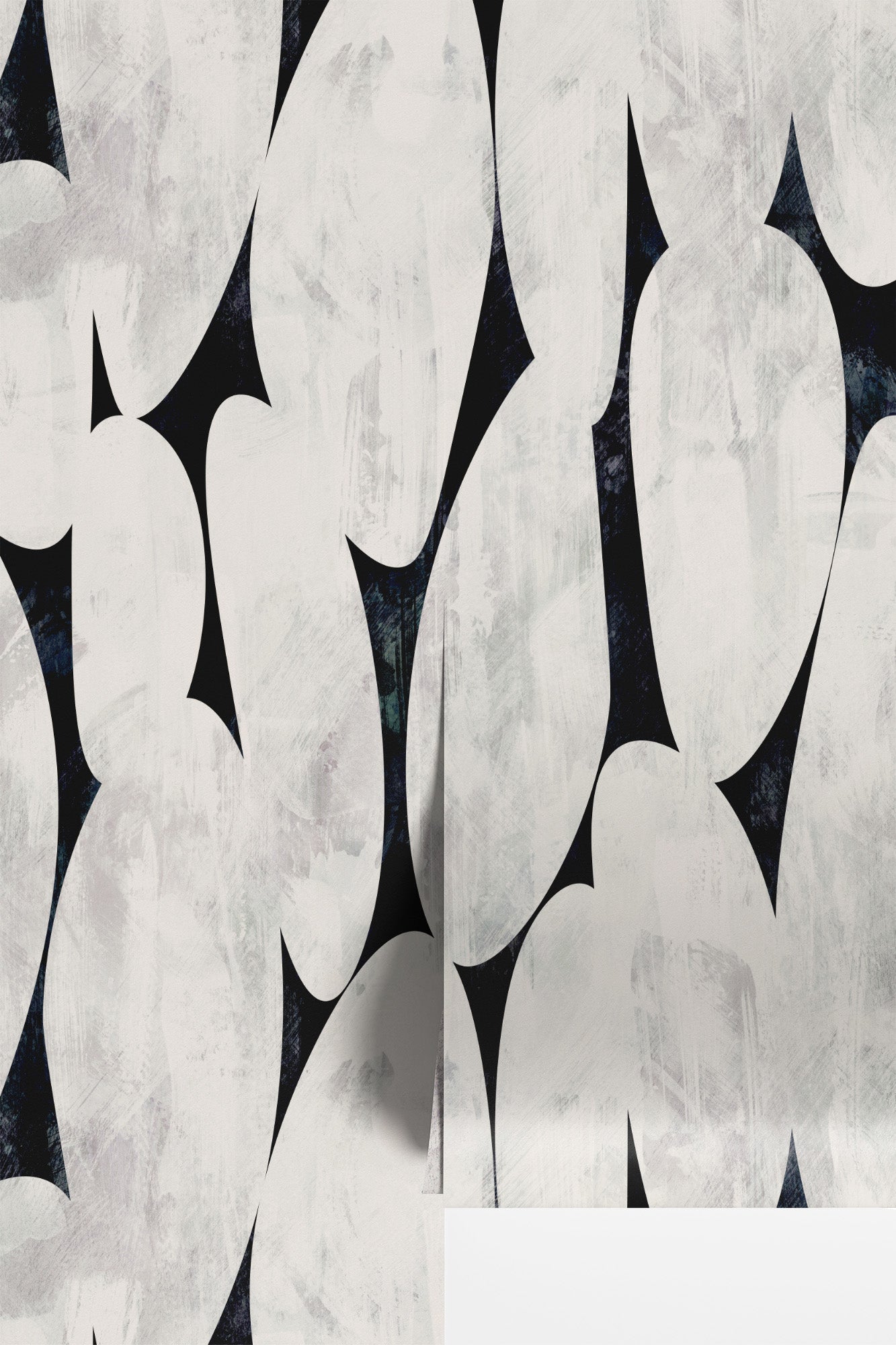 A striking, large-scale design of organic pebble and teardrop shapes rendered in a rich hand-painted texture. The contrast of creamy off-white forms against a deep navy-black ground creates a sense of depth and movement that transforms any room into a considered, design-forward space.