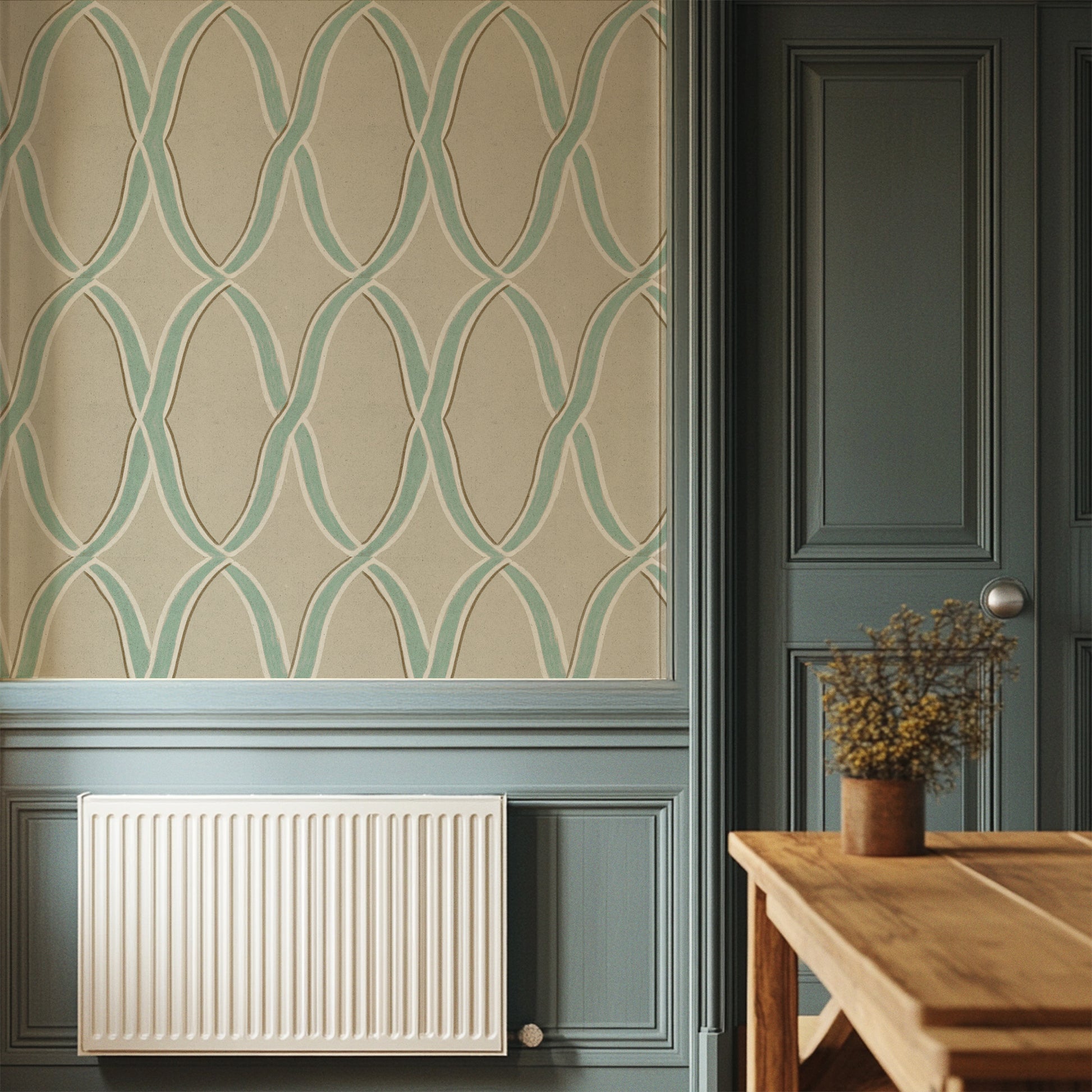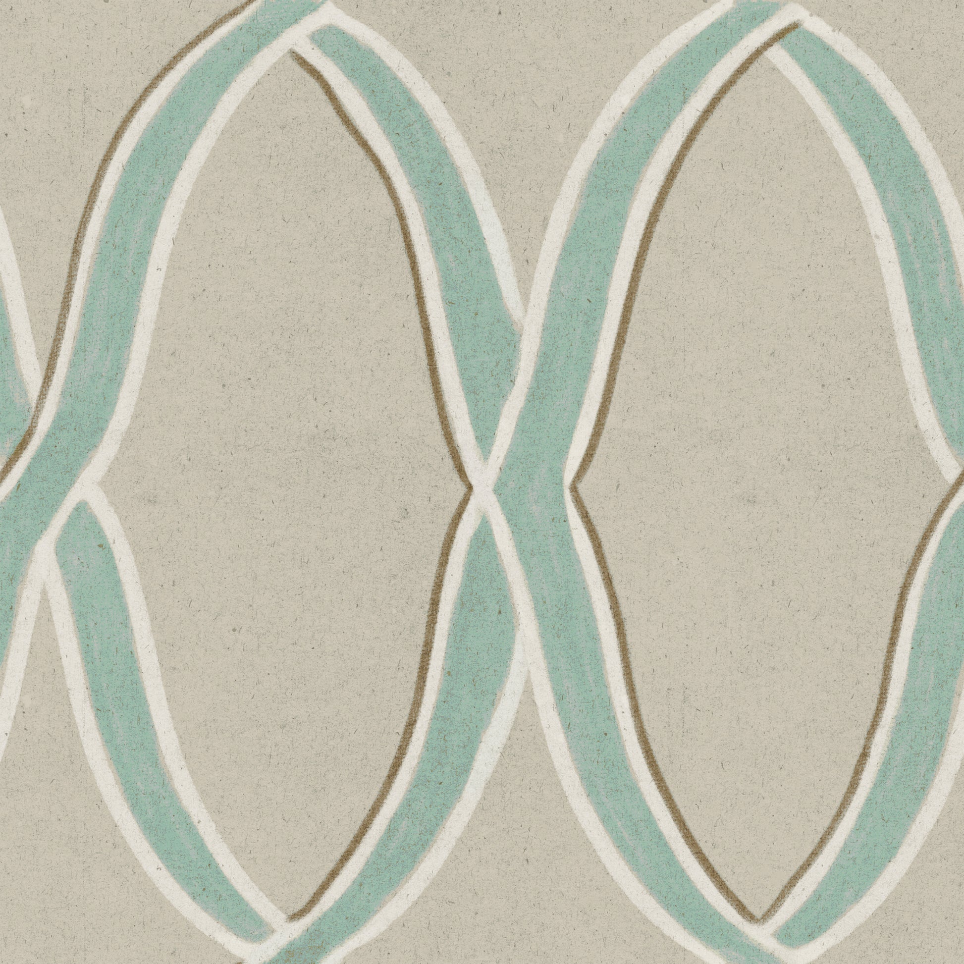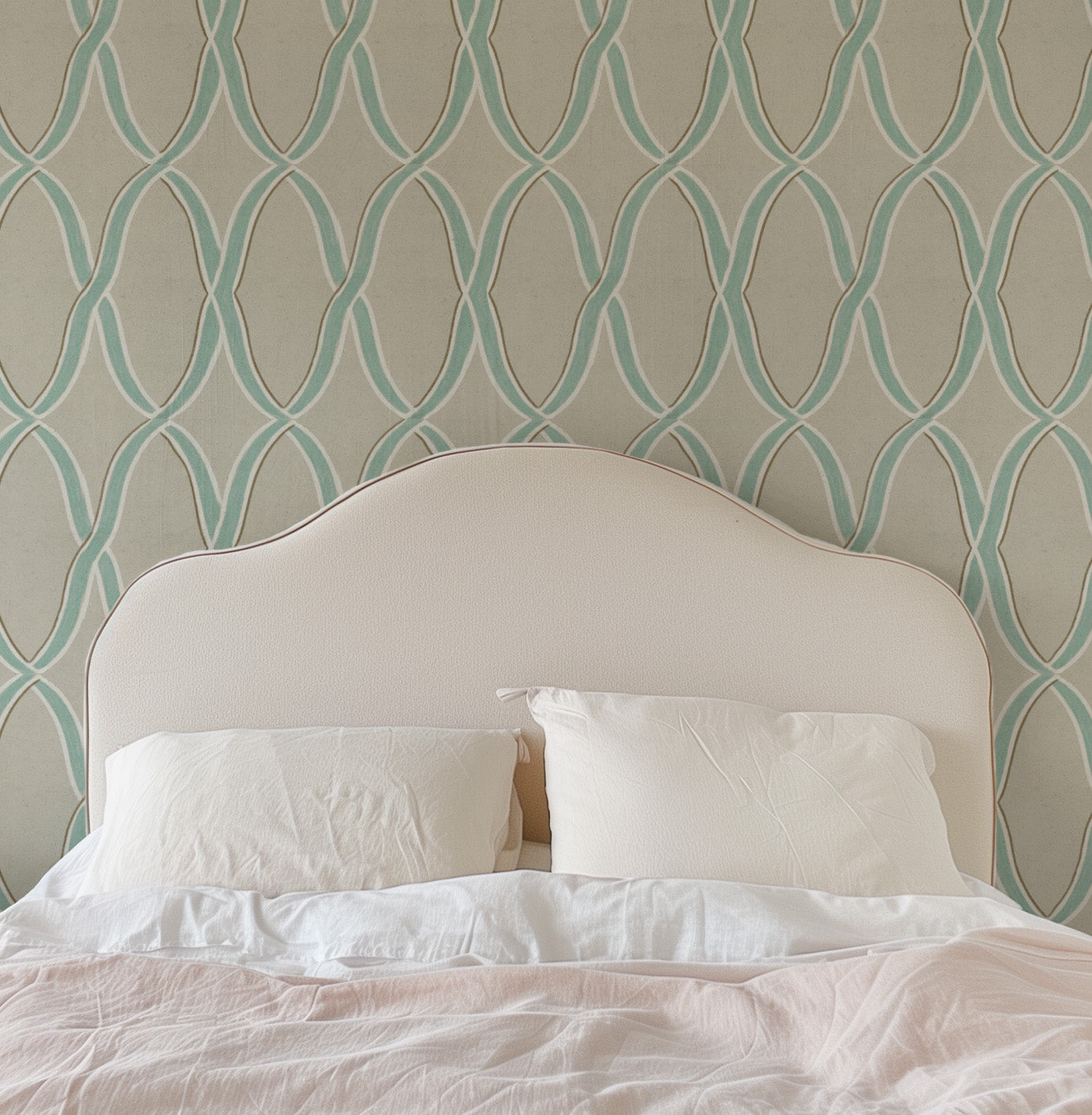 Inspired by Art Deco and mid-century modern design, its interlocking arched motifs in soft robin egg blue and muted natural beige offer a harmonious rhythm that creates a tranquil, ethereal atmosphere. The textured matte finish adds depth and subtle character, while the peel-and-stick application allows for easy installation and damage-free removal.