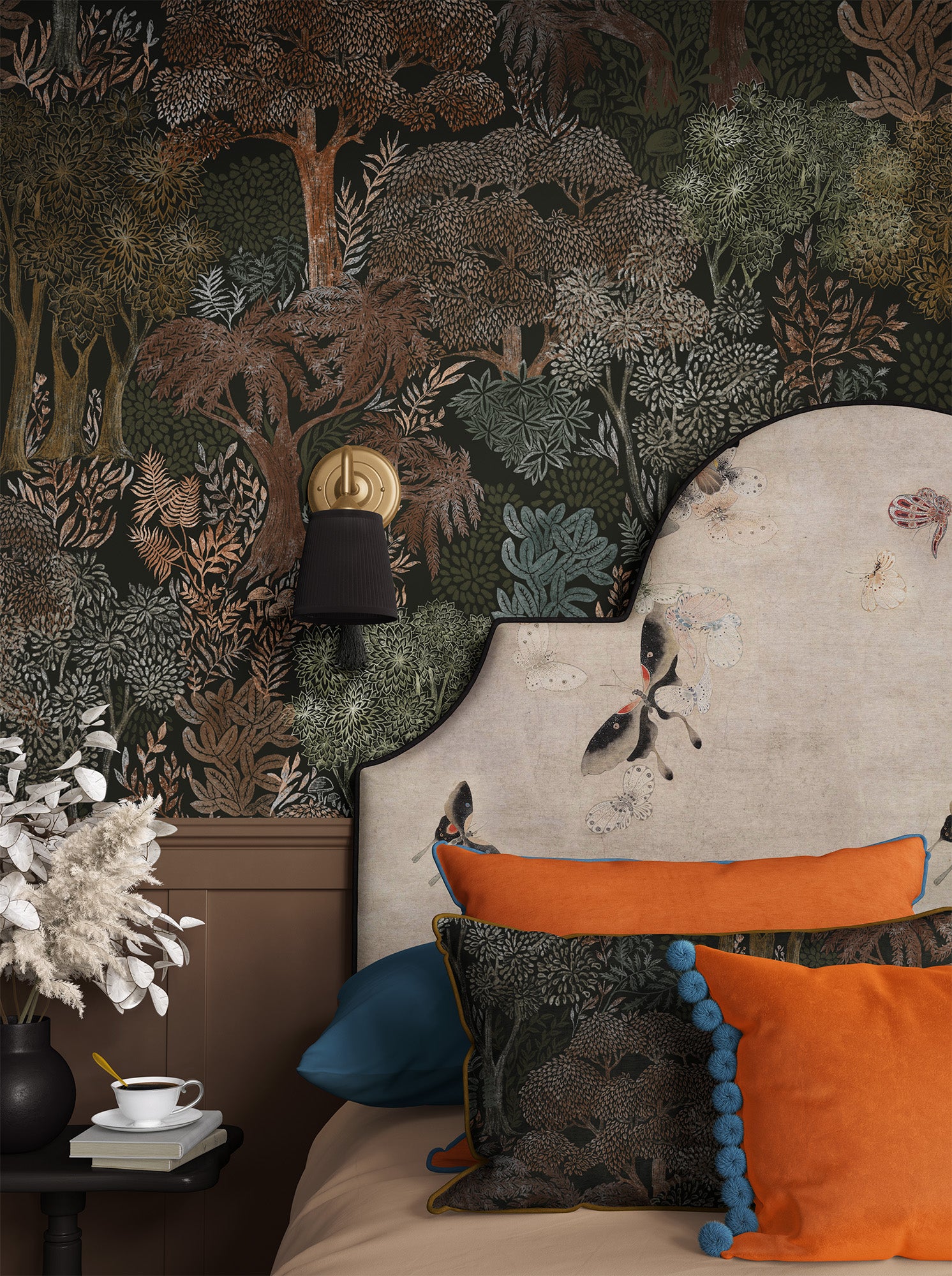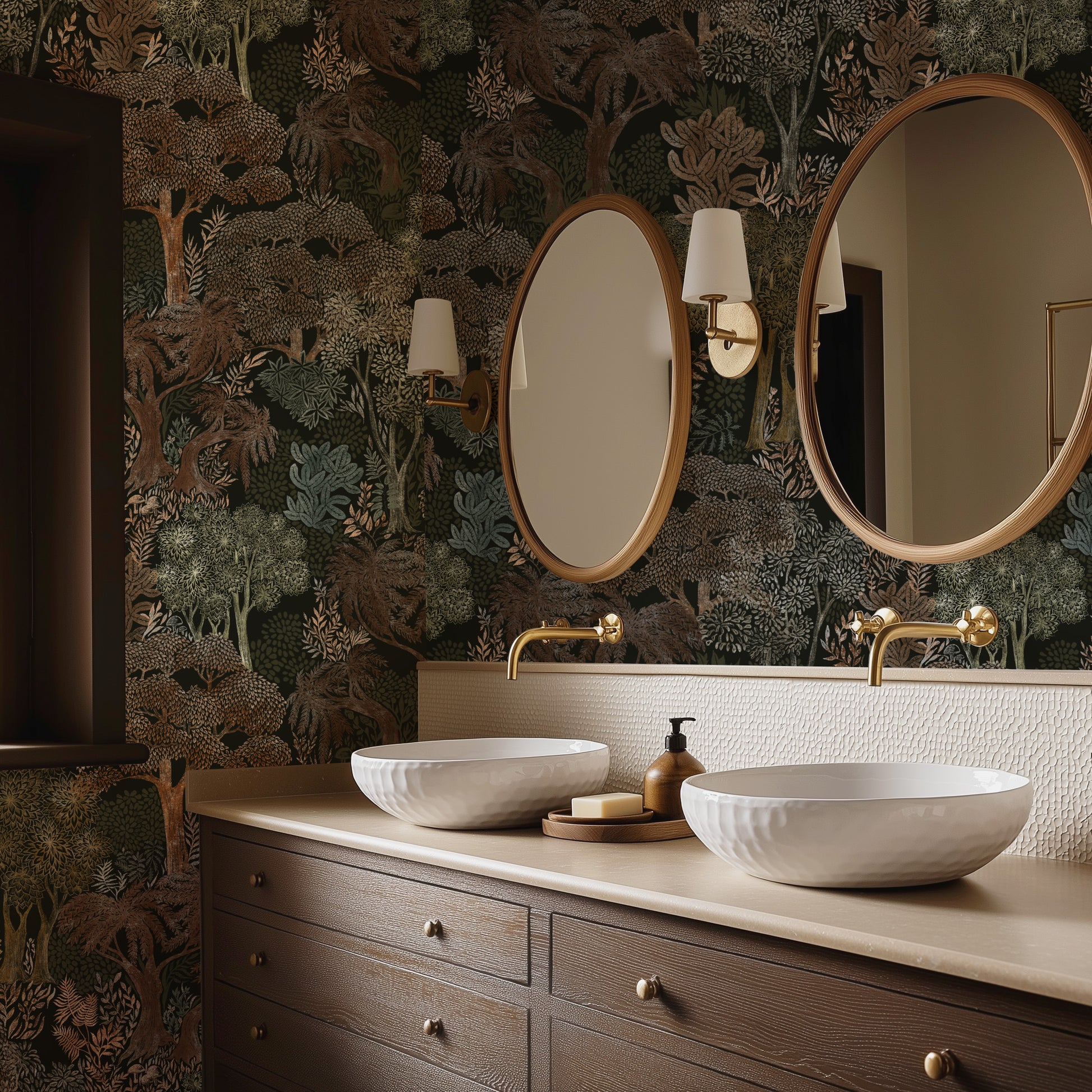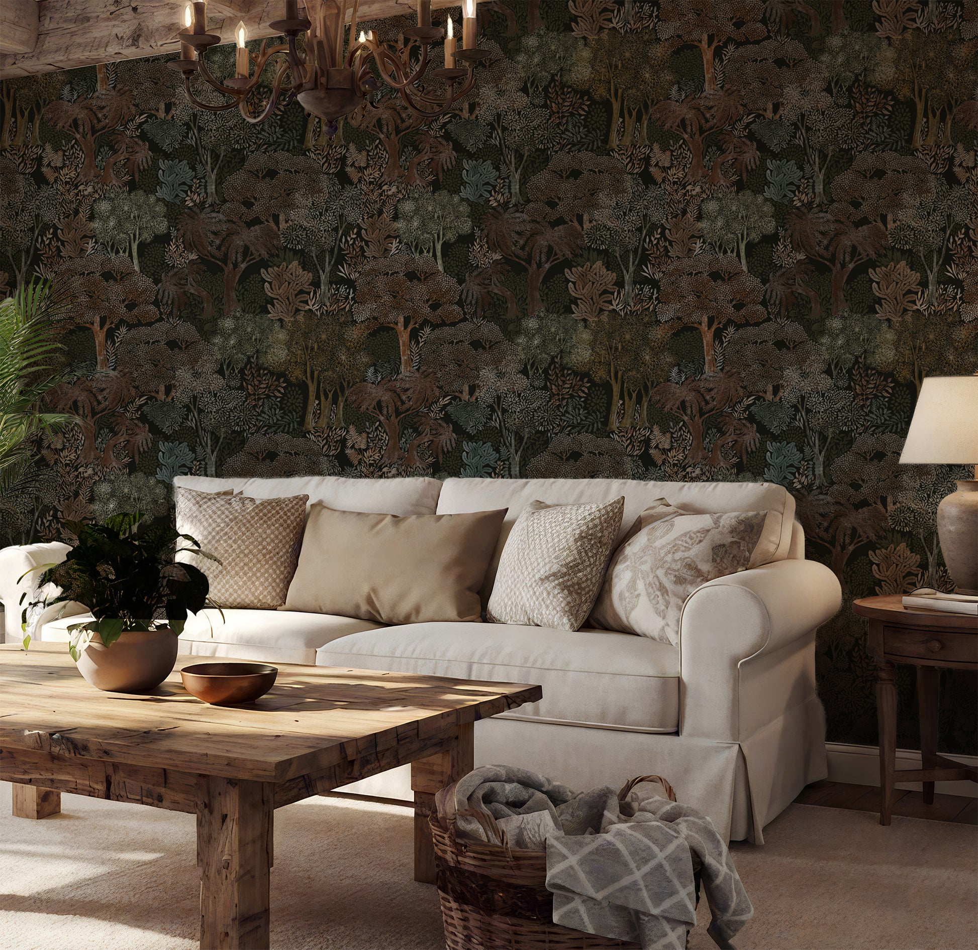 Transform your space with our dark forest wallpaper featuring hand-drawn trees and moody botanical foliage—perfect for boho maximalism, nature-inspired interiors.