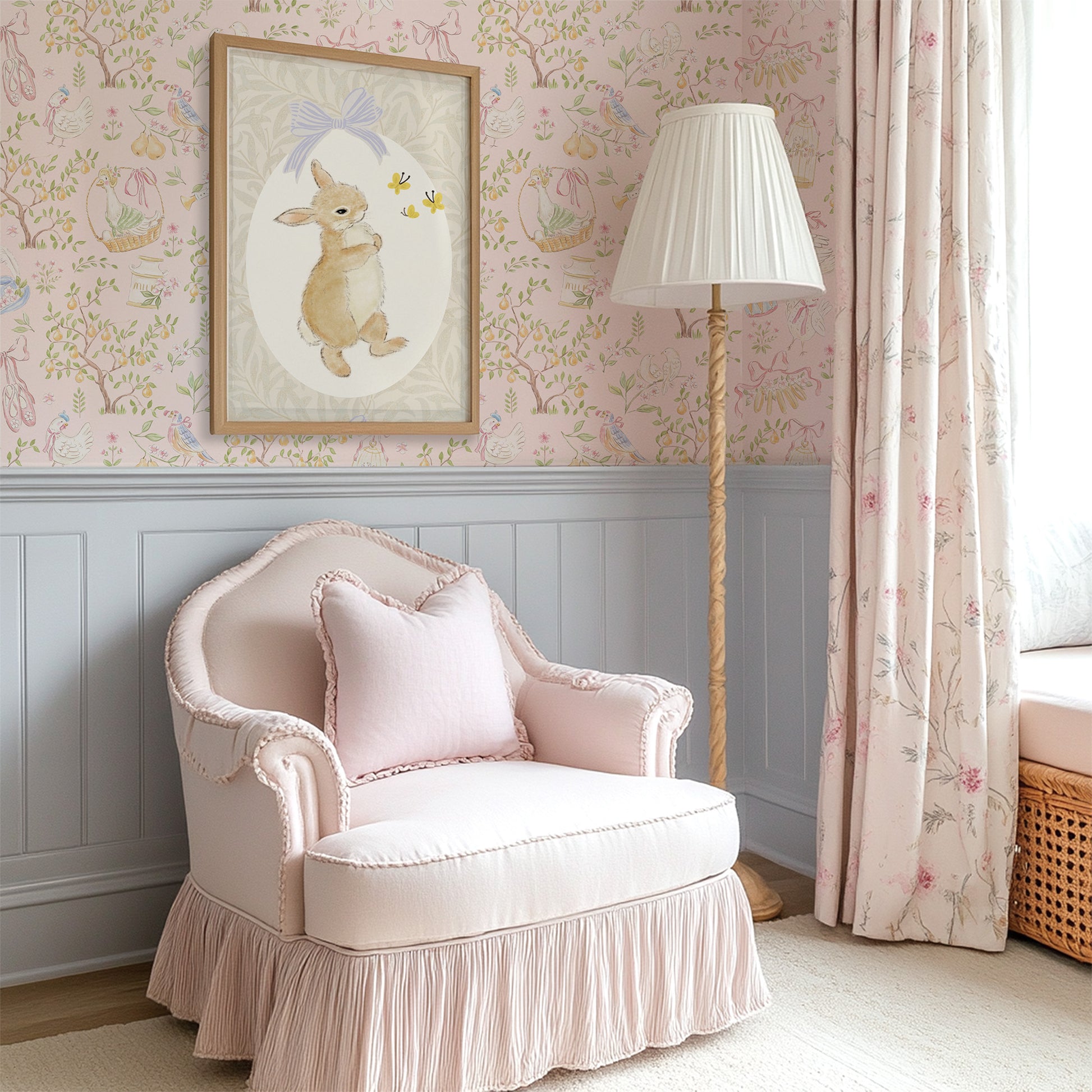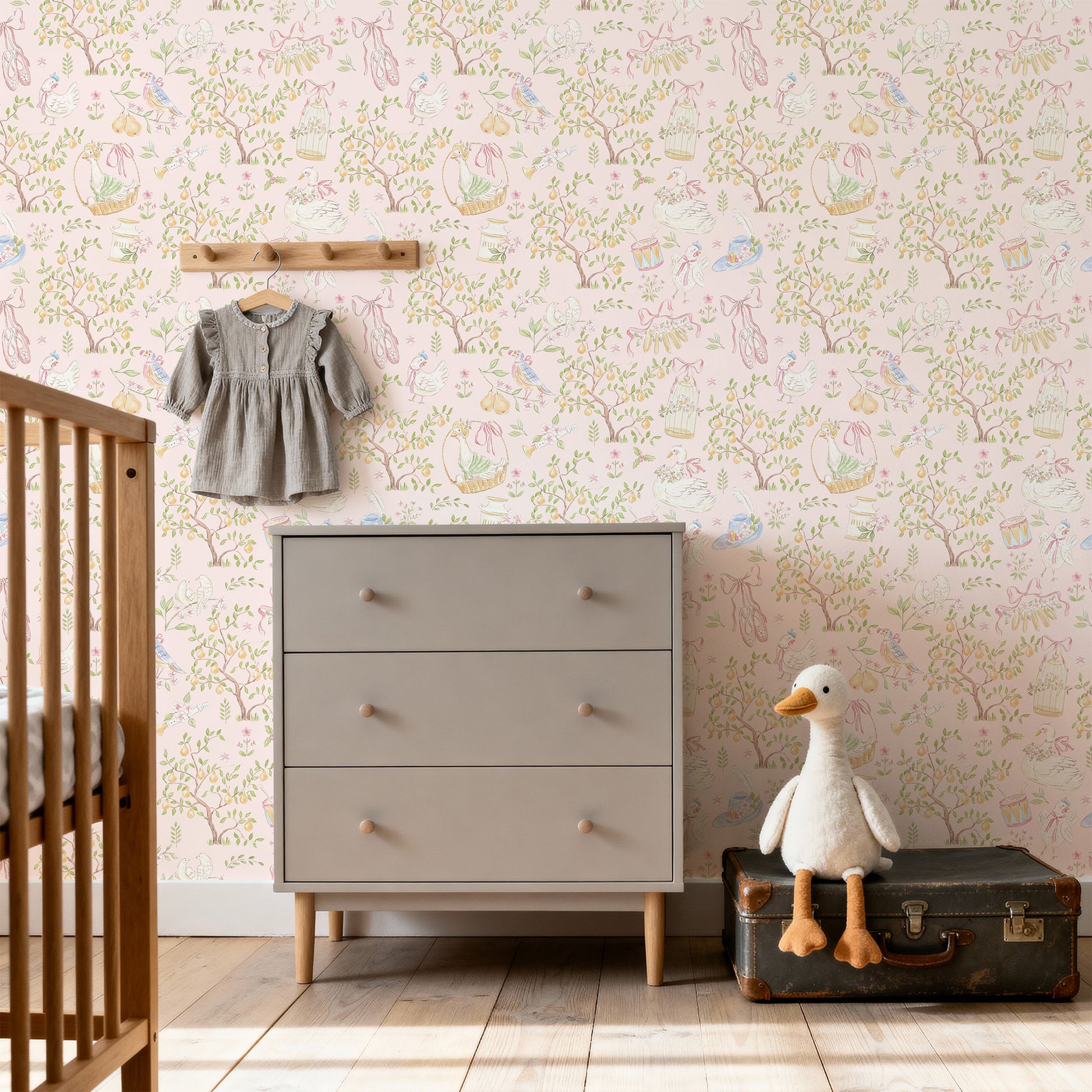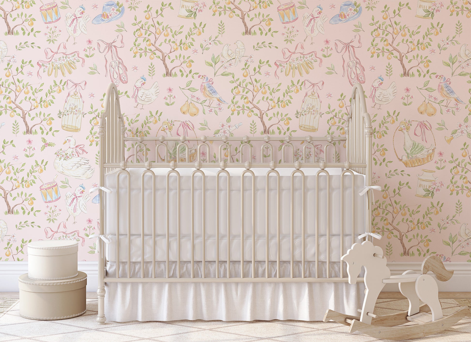 Enchant your little one’s space with our whimsical pink nursery wallpaper featuring hand-drawn leafy branches, flower baskets, ballet shoes, and sweet storybook animals in soft pastel tones, perfect for a calming baby girl room or playful kids’ bedroom backdrop.